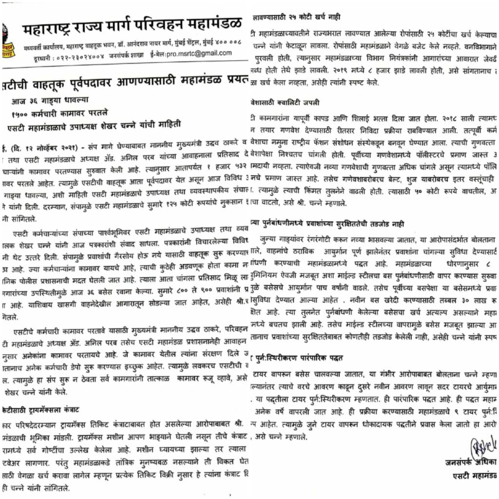 संप मागे घेण्याबाबत माननीय मुख्यमंत्री उद्धव ठाकरे व परिवहन मंत्री तथा एसटी महामंडळाचे अध्यक्ष अनिल परब यांच्या आवाहनाला प्रतिसाद देत एसटी कर्मचाऱ्यांनी कामावर परतण्यास सुरुवात केली आहे. त्यानुसार आतापर्यंत १ हजार ५३२ कर्मचारी कामावर परतले आहेत. त्यामुळे एसटीची वाहतूक आता पूर्वपदावर येत असून आज विविध आगारातून ३६ गाड्या धावल्या, अशी माहिती एसटी महामंडळाचे उपाध्यक्ष तथा व्यवस्थापकीय संचालक शेखर चन्ने यांनी दिली. दरम्यान, संपामुळे एसटी महामंडळाचे सुमारे १२५ कोटी रुपयांचे नुकसान झाल्याचेही त्यांनी सांगितले.